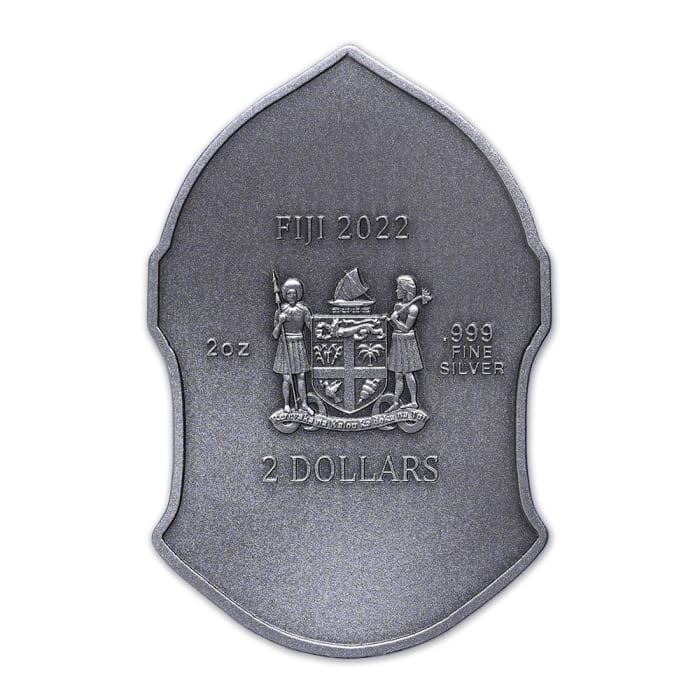 2022 2 oz Fiji Ancient Warriors – Crusader Knight Helmet Shaped 999 Silver Antiqued Coin